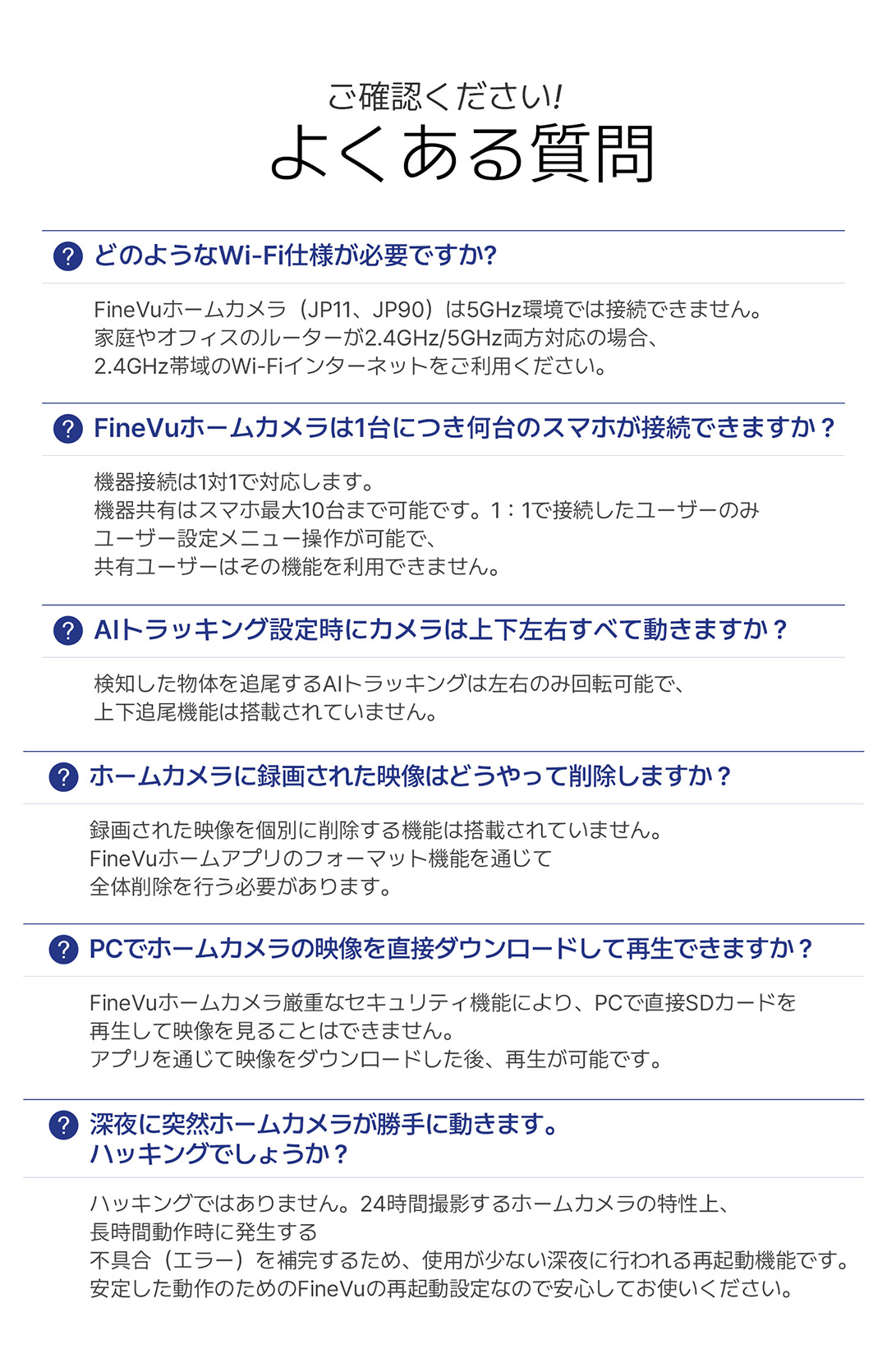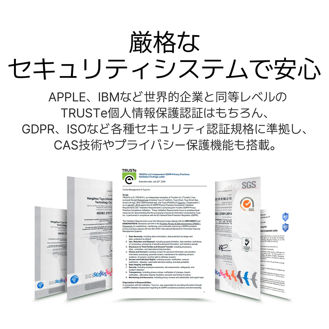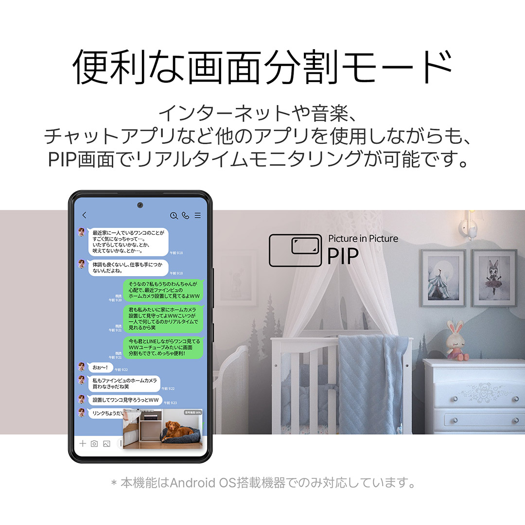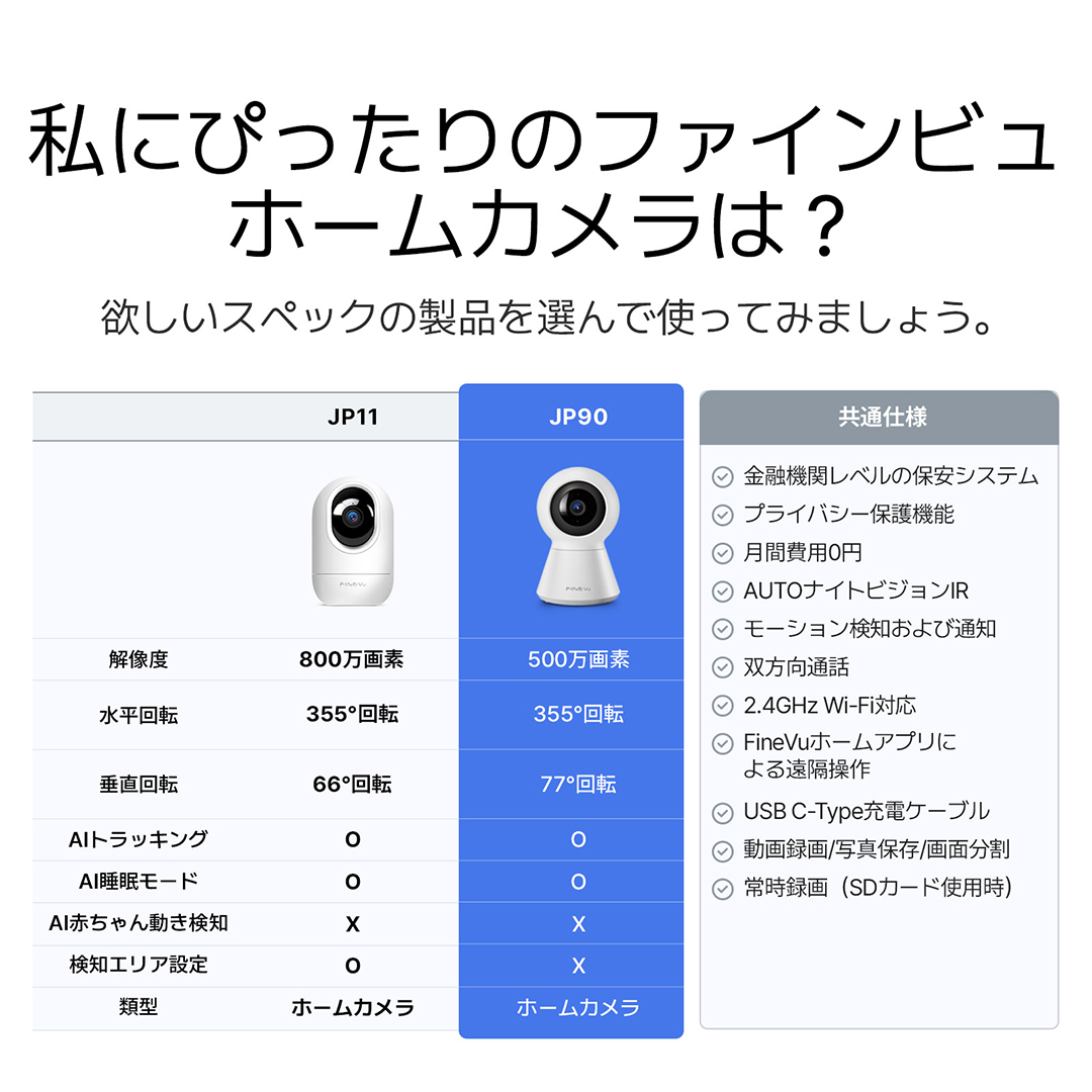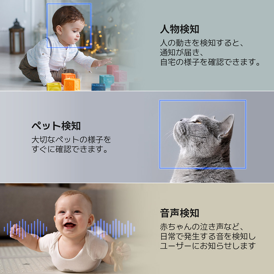 500万画素 2K QHD 超高画質で鮮明な映像を確認 広角ビュー 水平355°回転 / 垂直77°回転 AI睡眠モード1.0 睡眠中の寝返り回数や時間帯を記録・確認可能 AIトラッキング 動きを自動追跡し、モーション検知および通知機能をサポート 金融機関レベルのセキュリティシステム APPLEなど世界的企業水準のTRUSTe個人情報保護認証 AUTOナイトビジョンIR 暗い環境では赤外線LEDに自動切替、24時間鮮明な映像を撮影 Wi-Fi 2.4GHz対応 安定したワイヤレスネットワーク環境 USB Type-C充電ケーブル Androidスマートフォンと互可能な充電端子 アプリ機能 動画録画、写真保存、画面分割、双方向通話、常時録画(SDカード使用時) |