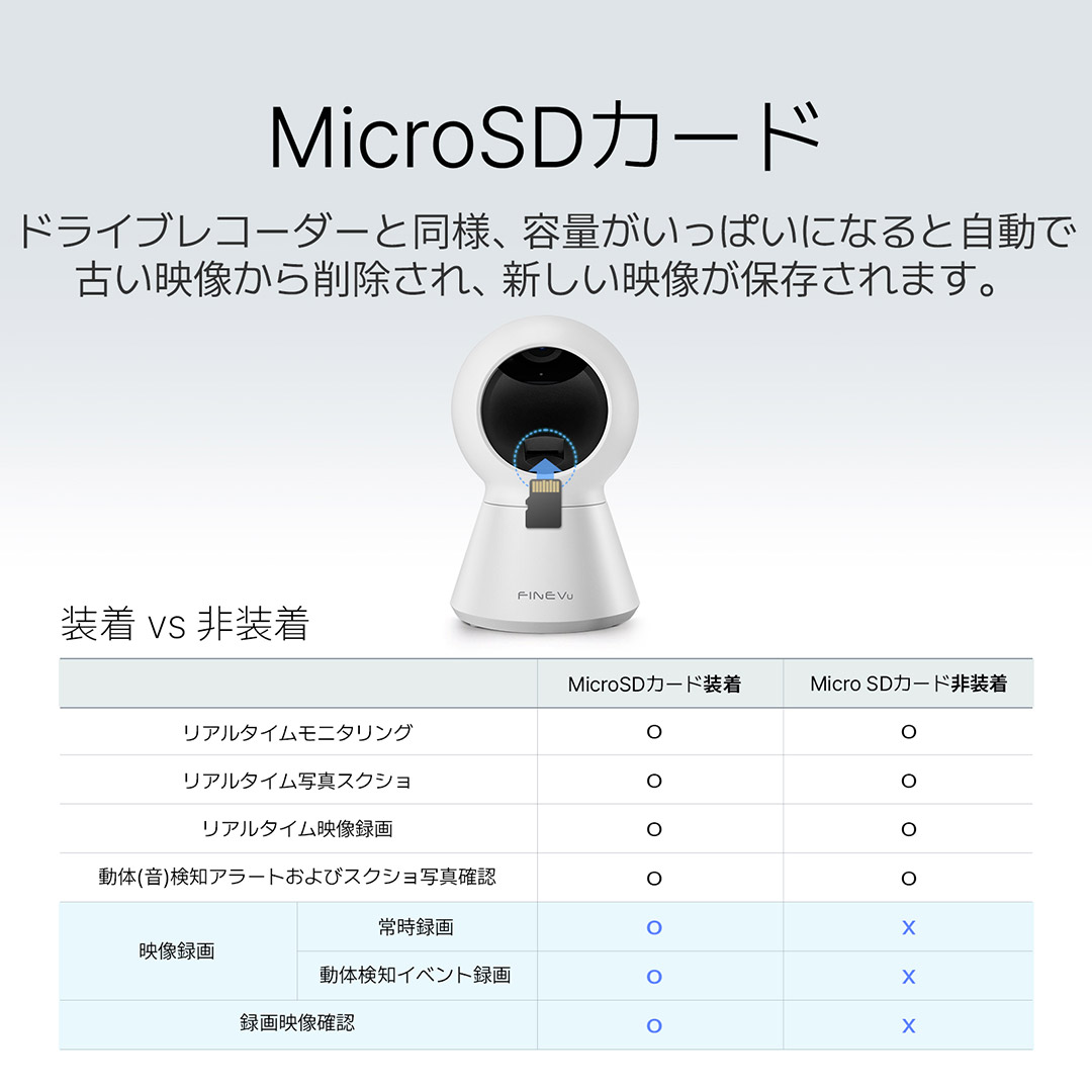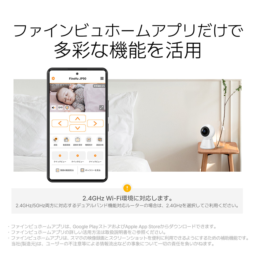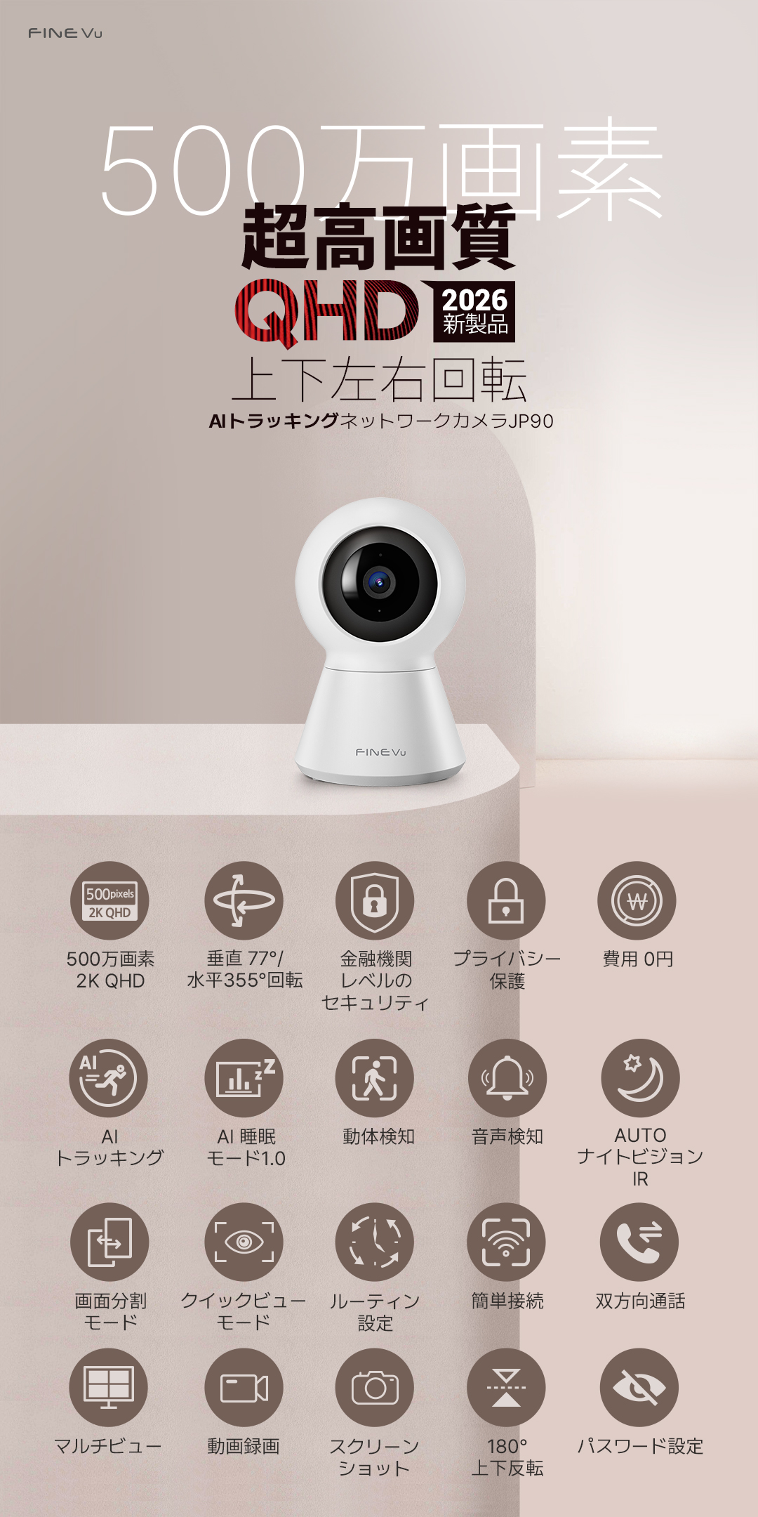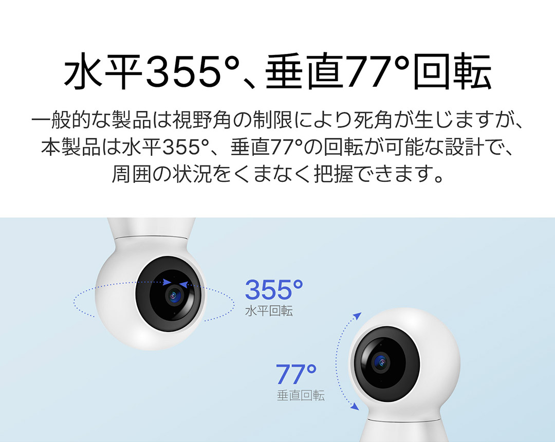 500万画素 2K QHD 超高画質で鮮明な映像を確認 広角ビュー 水平355°回転 / 垂直77°回転 AI睡眠モード1.0 睡眠中の寝返り回数や時間帯を記録・確認可能 AIトラッキング 動きを自動追跡し、モーション検知および通知機能をサポート 金融機関レベルのセキュリティシステム APPLEなど世界的企業水準のTRUSTe個人情報保護認証 AUTOナイトビジョンIR 暗い環境では赤外線LEDに自動切替、24時間鮮明な映像を撮影 Wi-Fi 2.4GHz対応 安定したワイヤレスネットワーク環境 USB Type-C充電ケーブル Androidスマートフォンと互可能な充電端子 アプリ機能 動画録画、写真保存、画面分割、双方向通話、常時録画(SDカード使用時) |