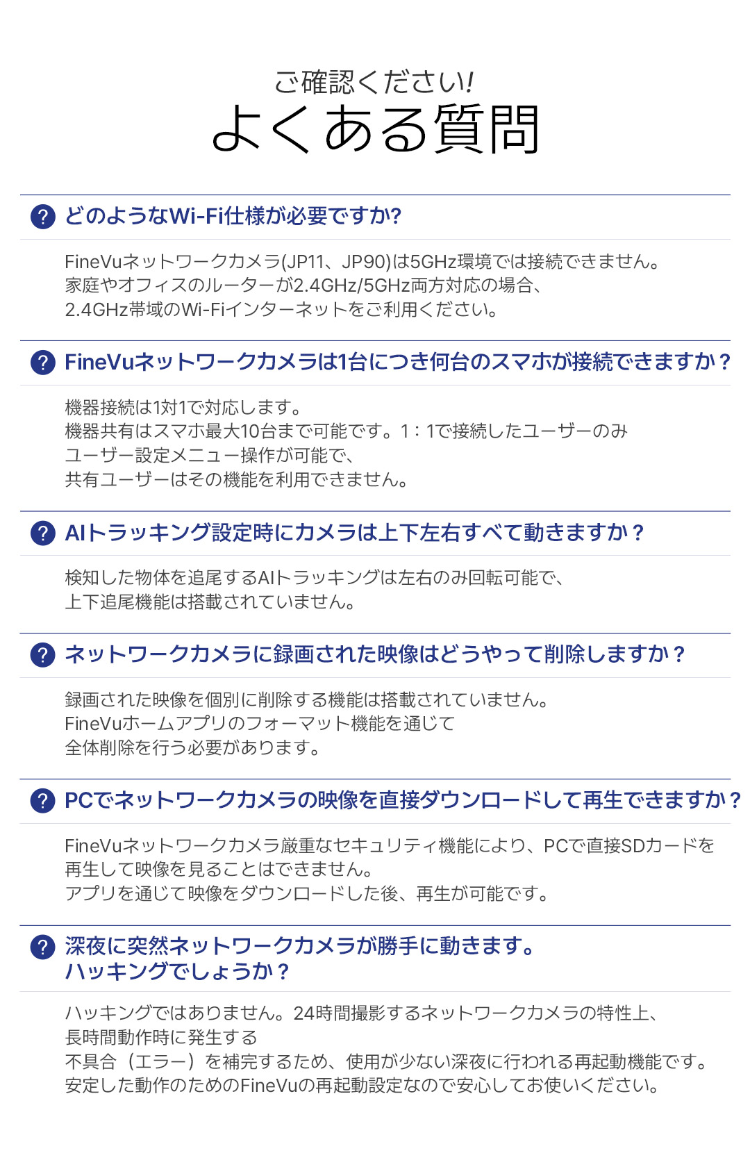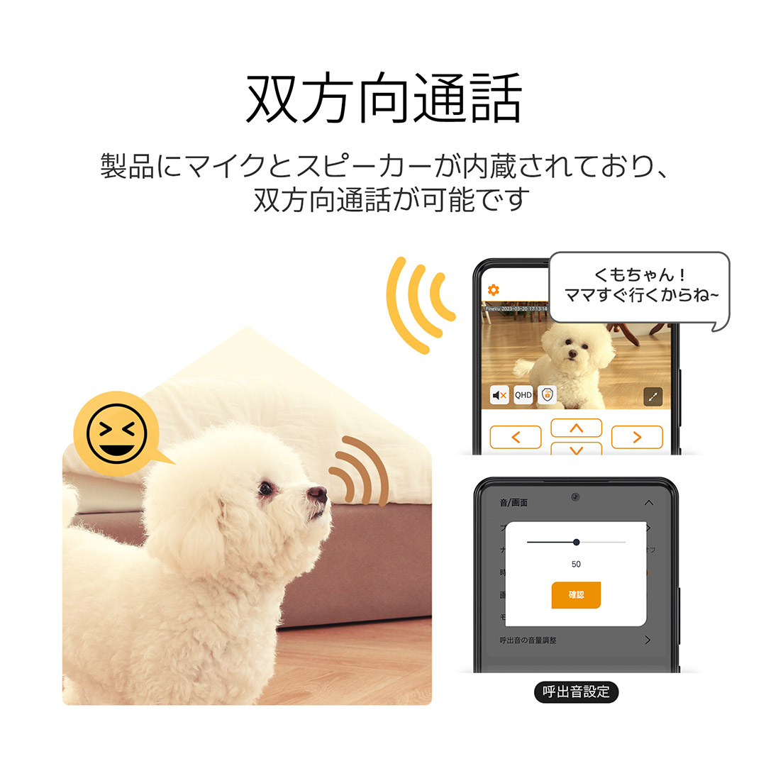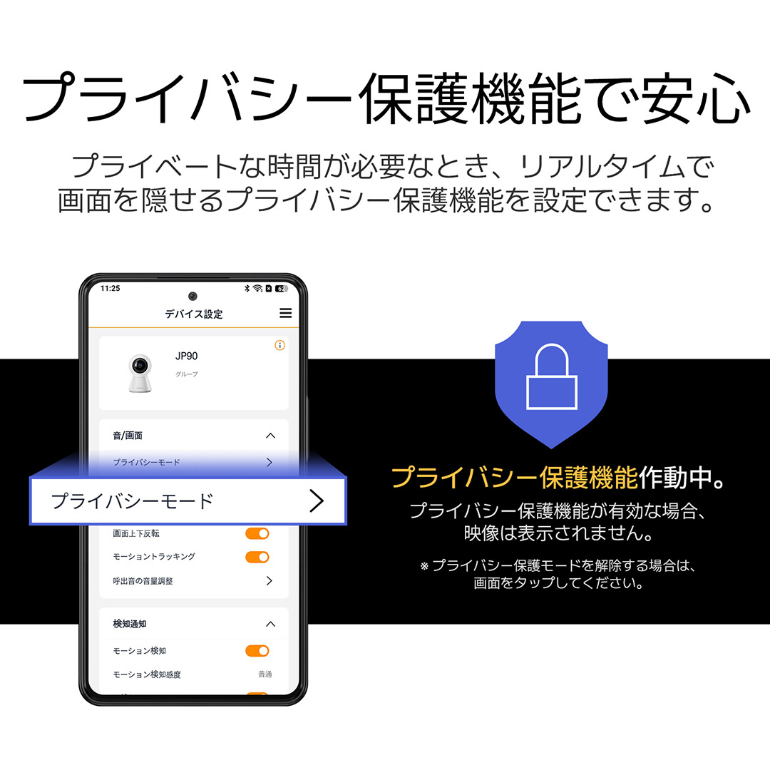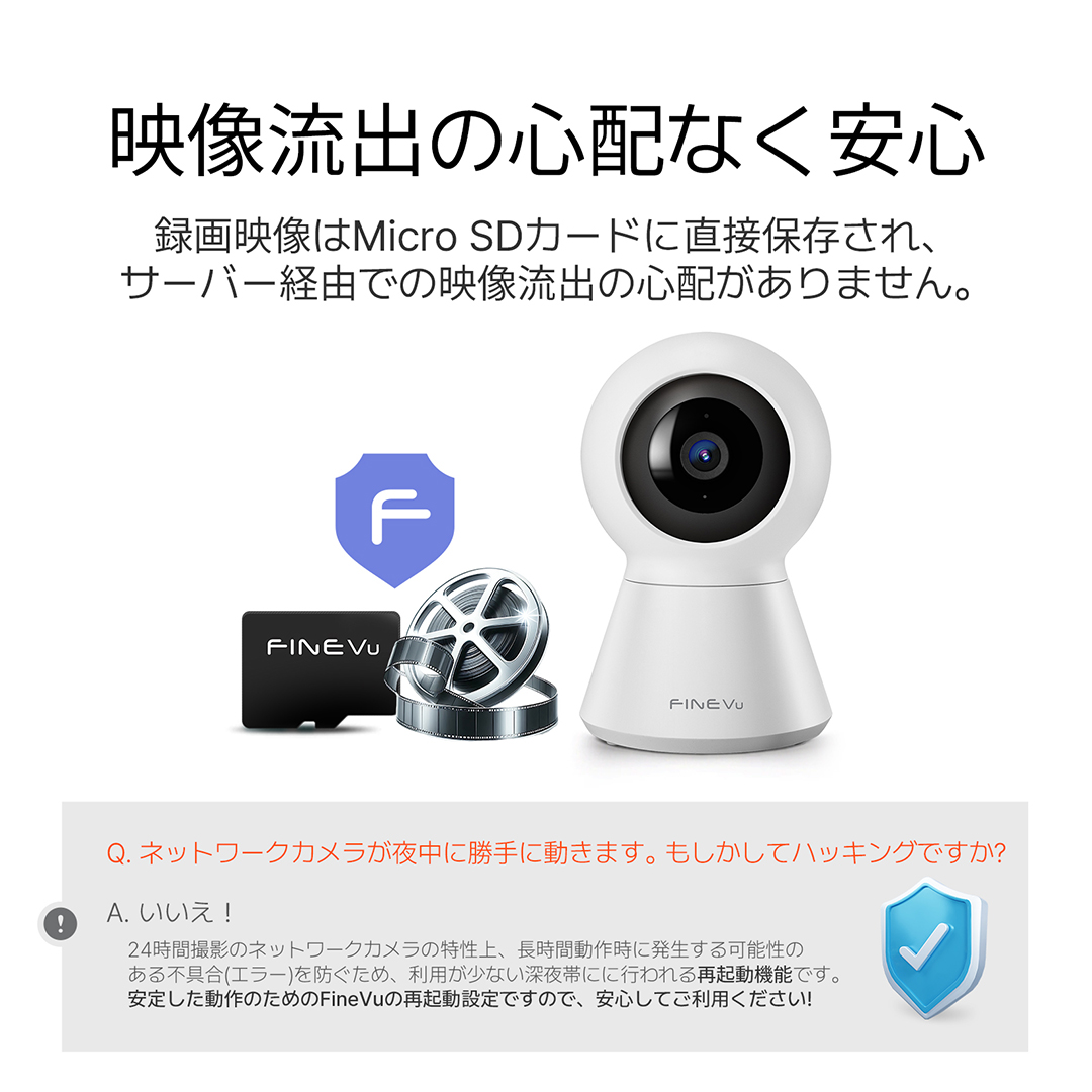 500万画素 2K QHD 超高画質で鮮明な映像を確認 広角ビュー 水平355°回転 / 垂直77°回転 AI睡眠モード1.0 睡眠中の寝返り回数や時間帯を記録・確認可能 AIトラッキング 動きを自動追跡し、モーション検知および通知機能をサポート 金融機関レベルのセキュリティシステム APPLEなど世界的企業水準のTRUSTe個人情報保護認証 AUTOナイトビジョンIR 暗い環境では赤外線LEDに自動切替、24時間鮮明な映像を撮影 Wi-Fi 2.4GHz対応 安定したワイヤレスネットワーク環境 USB Type-C充電ケーブル Androidスマートフォンと互可能な充電端子 アプリ機能 動画録画、写真保存、画面分割、双方向通話、常時録画(SDカード使用時) |